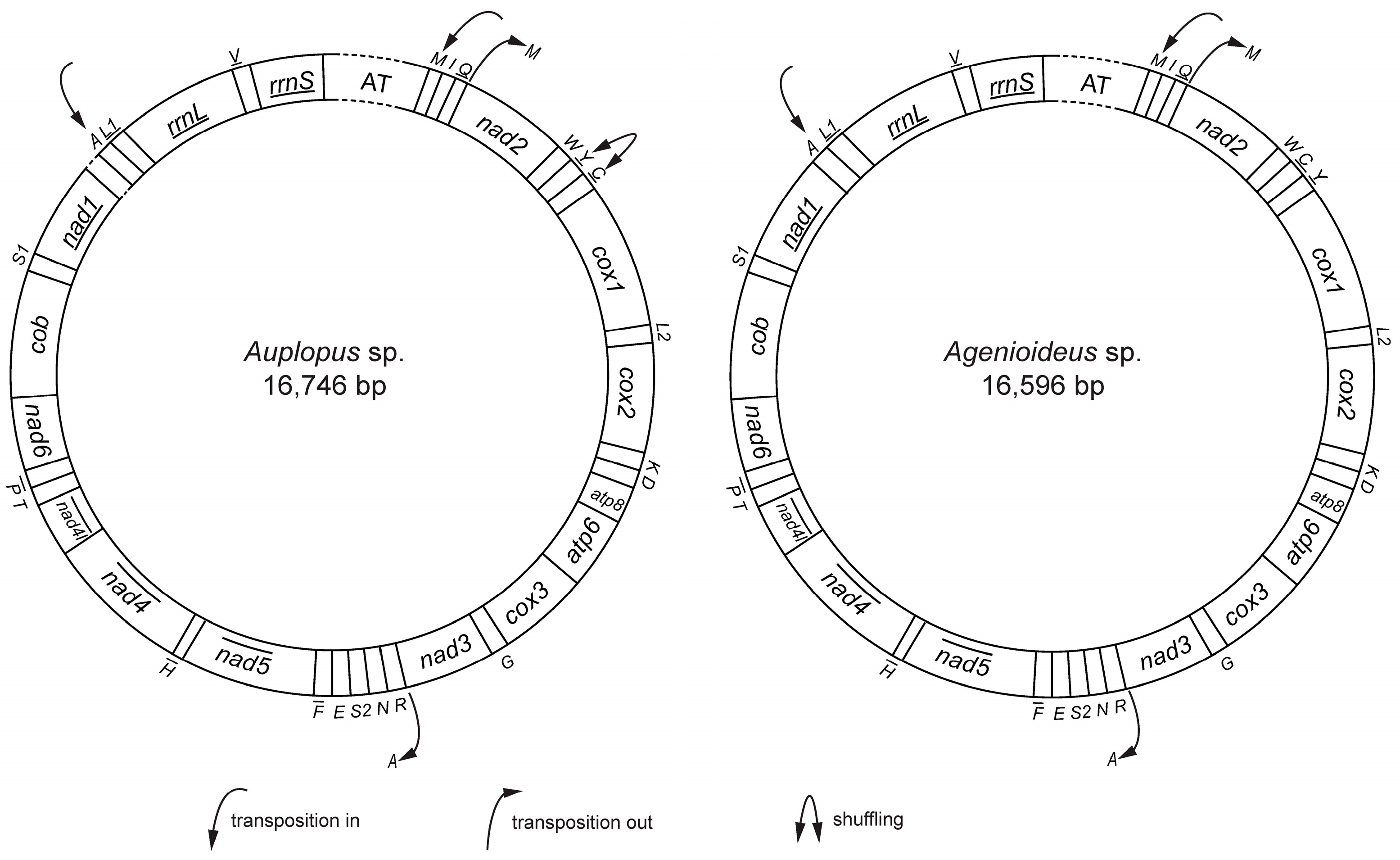 - Mao, M.; Austin, A.D.; Johnson, N.F.; Dowton, M. Coexistence of minicircular and a highly rearranged mtDNA molecule suggests that recombination shapes mitochondrial genome organization. Mol. Biol. Evol. 2014, 31, 636–644. [Google Scholar] [CrossRef] [PubMed]