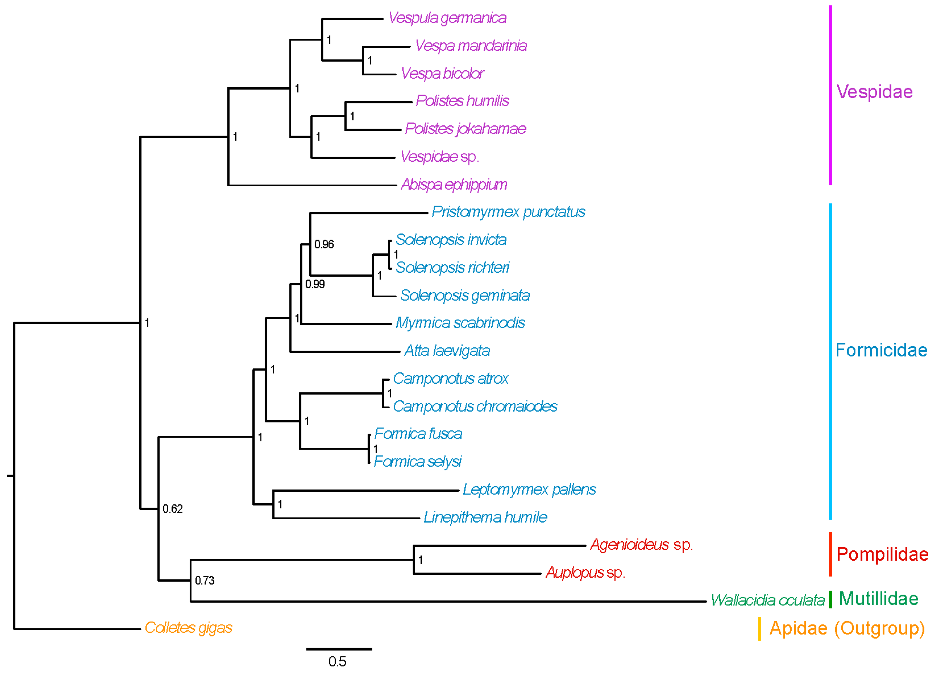 - Song, S.N.; Chen, P.Y.; Wei, S.J.; Chen, X.X. The mitochondrial genome of Polistes jokahamae and a phylogenetic analysis of the Vespoidea (Insecta: Hymenoptera). Mitochondr. DNA 2016, 27, 2783–2784. [Google Scholar]