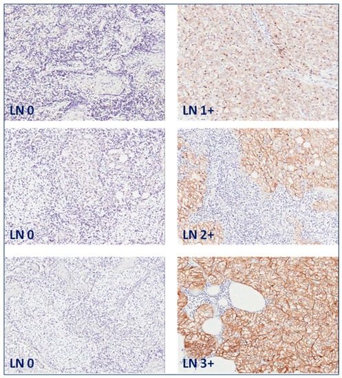 EpCAM expression in lymph node (LN) metastases. Matched normal lymph nodes without EpCAM expression (left panel) and lymph node metastases of prostate carcinoma with EpCAM expression of intensity score 1: weak; 2: moderate; and 3: strong (right panel). Original magnification: 200×.