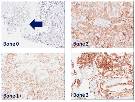 EpCAM expression in prostate carcinoma bone metastases. Bone metastases with EpCAM expression of intensity score 1: weak; 2: moderate; and 3: strong. Arrow points towards an area of bone metastasis in bone without EpCAM expression. Original magnification: 200×.