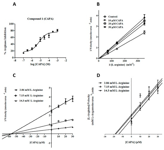The mechanism of inhibition and the inhibition constant (Ki) of compound 1 (CAPA) was assessed by enzyme-kinetic studies. The kinetic data were used to generate the Lineweaver–Burk, Dixon and Cornish–Bowden plots (Figure 3B–D), showing that CAPA is a competitive inhibitor of arginase [41].