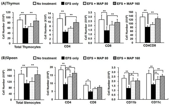 As shown in Figure 2, both the total cell numbers and the number of each lymphocyte subset were dramatically decreased in the thymus (Figure 2A) and spleen (Figure 2B) by chronic EFS stress, and this effect was considered to be related to the atrophy of the lymphoid organs. The thymocyte subsets—including CD4+, CD8+, and CD4+CD8+ lymphocytes—were all significantly protected by the high dose of MAP (160 mg/kg), whereas the splenocyte subsets—including CD4+, CD11b+, and CD11c+ lymphocytes—were significantly increased by administration of both doses of MAP (80 and 160 mg/kg).