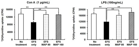On the other hand, not only the normal lymphocytes but also the immunized lymphocytes were analyzed for their functional capability. First, the total splenocytes isolated from normal mice were cultured for the proliferation assay in which the lymphocyte was induced by LPS or Con A, a mitogen for B or T cells, respectively (Figure 3). The susceptibility of lymphocytes to these mitogens was presented as the degree of proliferation, which can be interpreted as their functional properties. The impaired proliferative activity of the lymphocyte induced by EFS-mediated chronic stress was significantly improved with MAP treatment (Figure 3).