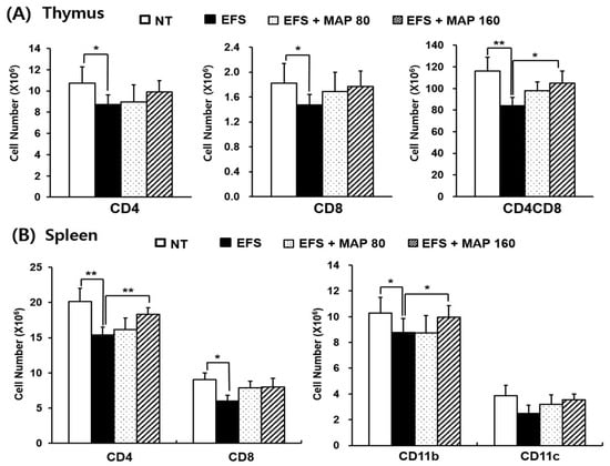 The number of each lymphocyte subset in both spleen and thymus was decreased by chronic EFS stress and significantly restored by MAP treatment, regardless of immunization (Figure 2 and Figure 4). When immunized, the CD4+CD8+ T lymphocytes were significantly protected by the high dose of MAP (160 mg/kg; Figure 4A), and the number of splenocyte subsets—including the CD4+ and CD11b+ lymphocytes—was significantly restored by the administration of high-dose MAP (Figure 4B). The absolute numbers of CD11b+ and CD11c+ cells, which are responsible for antigen processing, were considerably increased overall in all groups (Figure 4B) compared to those in non-immunized groups (Figure 2B), and the degree of decrease caused by EFS stress lessened in all subtypes after the immunization.
