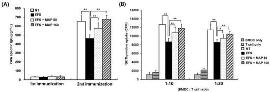 Spleen cells were harvested from OVA-immunized mice as described above. The splenocyte suspension in Dulbecco’s modified Eagle’s medium (DMEM, Hyclone) was incubated in a nylon wool column to isolate only T cells. In addition, bone marrow-derived cells (BMDCs) were prepared from normal mice for co-culturing. The BMDCs were induced to differentiate into macrophages or dendritic cells by incubation with granulocyte macrophage colony stimulating factor (GM-CSF; 40 ng/mL) for six days. After the culture period, BMDCs were harvested and further cultured in the presence of p-OVA (50 µg/mL) at 37 °C. The isolated T cells and OVA-pulsed BMDCs were then co-cultured in a 10:1 or 20:1 ratio for three days. On the last culture day, the proliferation of OVA-specific T cells was measured using a 3(H)-thymidine incorporation assay as previously described.