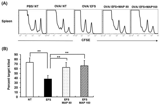 Immune enhancing effect of MAP on activity of cytotoxic T lymphocytes (CTLs) in chronically stressed mice. Mice are grouped as described in Figure 1 and were OVA-immunized. (A) Histogram peaks show number of target cells in untreated PBS-immunized group, determined to indicate level of two target cell populations; (B) Specific killing (%) of OVA (257–264) peptide-pulsed target cells in the spleen. Ratio of carboxyfluorescein succinimidyl ester (CFSE)high and CFSElow was calculated as a numerical value to present specific killing. Values are means ± SEM of three experiments, n = 5, ** p < 0.01 compared with control.