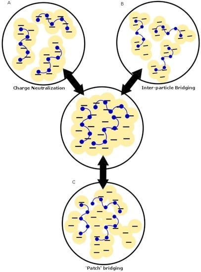Diagram showing the different mechanisms involved in coagulation-flocculation: (A) inter-particle bridging; (B) charge neutralization; and (C) “patch” adsorption. Redrawn with permission from [4] Li, J.; et al. Optimizing coagulation and flocculation process for kaolinite suspension with chitosan. Colloids Surf. A Physicochem. Eng. Asp. 2013.