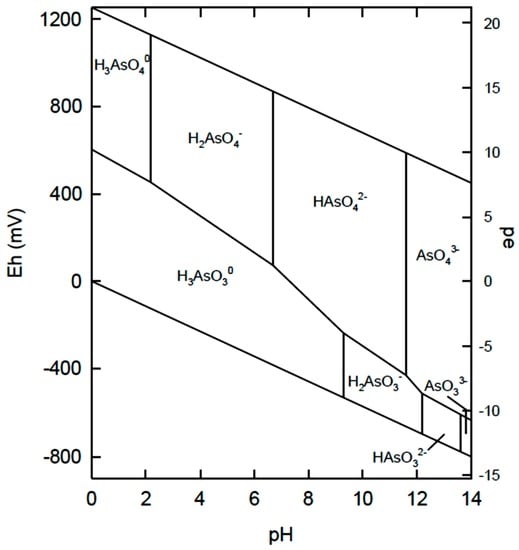 Eh–pH diagram of arsenic [34] Smedley, P.L.; Kinniburgh, D.G. Sources and behaviour of arsenic in natural water. In United Nations Synthesis Report on Arsenic in Drinking Water, 2005; www.who.int/water_sanitation_health/dwq/arsenicun1.pdf (Date accessed 1 July 2016).