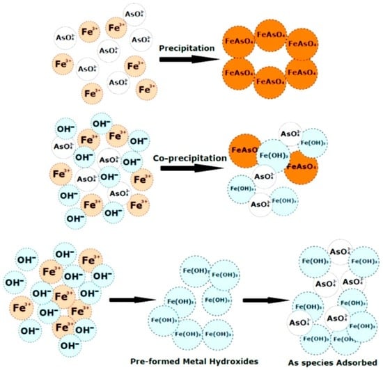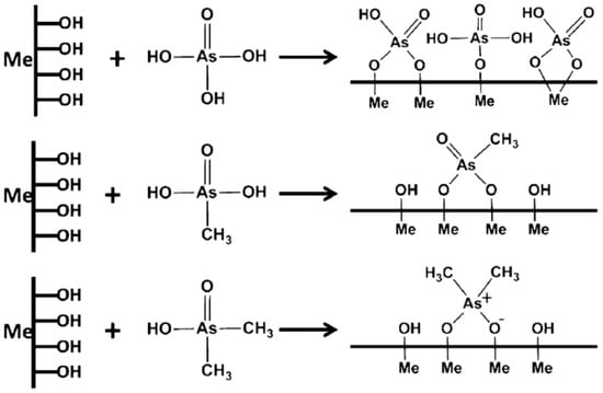 Fewer reports using coagulation-flocculation processes for the removal of organic arsenic (organoarsenicals) are available. Organoarsenicals often contaminate aquatic environments through their use as pesticides and herbicides. Organoarsenicals also form via methylation of inorganic arsenic through bacterial and fungal action. Biomethylation of arsenate may yield monomethyl arsenate (MMA) or dimethyl arsenate (DMA), where such species have been reported in a California lake and a river system in Spain [36]. Hu et al. studied the removal of these two organic species and compared it to arsenate removal using common coagulants: Fe(III) chloride, aluminum chloride and polyaluminum chloride. As with other arsenate studies [35,40], iron(III) performed better than aluminum, where the removal efficiency (%) varied as follows: As(V) > MMA > DMA. This trend led to the conclusion that an increase in methylation hindered the removal of As species, and may relate to variable water solubility and charge effects described above. The ionic binding of As species onto the surface of the Fe/Al hydroxide illustrate the key mechanism of As removal of As in Figure 4 [36].