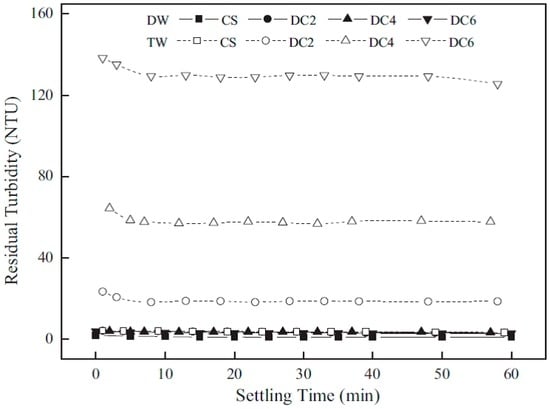 Overall, there was a good removal efficacy of the variable MW values of chitosan in DW. CS had low residual turbidity in TW, while other types of chitosan performed poorly in TW, shown by high residual turbidity. All systems settled rapidly in both DW and TW, where settling was accomplished within 10 min. With the exception of DC2, DC4 and DC6 in TW, the residual turbidity was below 5 NTU. In TW, the residual turbidity decreased as the MW increased.