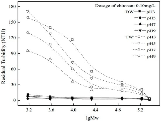 Influence of the logarithmic molecular weight (lgMW) and chitosan dosage on the coagulation and flocculation of the kaolinite suspension at different pH in demineralized water (DW) and tap water (TW). Initial turbidity of kaolinite suspension 200 NTU, settling time 5 min. Reproduced with permission from [4] Li, J.; et al. Optimizing coagulation and flocculation process for kaolinite suspension with chitosan. Colloids Surf. A Physicochem. Eng. Asp. 2013.