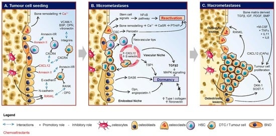 Stages of cancer cell colonisation of the bone. (A) Tumour cells are attracted to the high levels of chemoattractants in the bone marrow (red), such as Ca2+, CXCL12 (C–X–C motif chemokine ligand 12) and RANKL. In the endosteal niche, hematopoietic stem cells (HSC) and disseminated tumour cells (DTCs) competitively bind to osteoblasts through interactions between CXCR4/CXCL12 and Annexin II/Annexin II receptor. In addition, expression of E-cadherin on the DTC surface can form adherin junctions with N-cadherin expressing osteoblasts as well as form interactions between RANK and RANKL, the latter of which is secreted by osteoblasts and osteocytes. Furthermore, DTCs also express integrins which can interact with a number of factors in the bone marrow (VCAM-1, bone sialoprotein (BSP), osteopontin (OPN), victronectin); (B) Once in the bone marrow, DTCs compete with HSCs for the endosteal niche. DTCs are able to proliferate; although a majority of cells die or remain dormant. The local environment has a significant impact on the fate of these DTCs. Local levels of type I collagen and fibronectin have been demonstrated to repress dormancy. Dormant cells have been reported to be found in the vascular niche, in close proximity to capillaries and within regions rich in CXCL12 and E-selection. The vascular niche is able to secrete thrombospondin-1 (TSP1) and Notch-1, which are important for maintaining dormancy. Several studies also show TGFβ2, can play an important role in the maintenance of dormancy through MAPK signalling, while TGFβ1 secreted from neovascular tips is associated with tumour cell reactivation. Periostin can also be secreted by neovascular tips as well as Cancer Stem Cells (CSCs), leading to DTC reactivation. The endosteal (osteoblastic) niche can also maintain tumour cell dormancy through the secretion of GAS6 by osteoblasts and OPN and angiopoietin-1 by spindle-shaped N-cadherin+ osteoblasts (SNOs). To exit dormancy, osteoclasts are able to release stem cell signals, triggering the NFκB pathway. We also know that the release of Ca2+ from normal bone remodelling can bind to calcium sensing receptor (CaSR) to stimulate PTHrP, leading to tumour cell reactivation; (C) After DTCs are reactivated, they become proliferative and establish macrometastases. Bone matrix derived TGFβ, IGF, PDGF and BMP can promote tumour cell proliferation, as well as Cancer Associated Fibroblasts (CAFs) secreted CXCL12. Once macrometastases are established, the tumour can release factors that drive osteoclasts (M-CSF, TNFα, IL-11 and IL-8) to induce osteolytic lesions through the stimulation of RANKL. Tumour cells have also been shown to release miRNAs that stimulate osteogenesis through the down-regulation of DKK-1 and SOST-1. Finally, association of tumour cells with the endosteal niche has been associated with tumour cell growth.