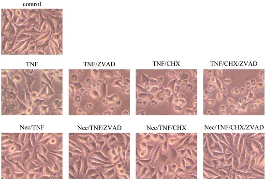 14. Vanlangenakker, N.; Bertrand, M.J.M.; Bogaert, P.; Vandenabeele, P.; Vanden Berghe, T. TNF-induced necroptosis in L929 cells is tightly regulated by multiple TNFR1 complex I and II members. Cell Death Dis. 2011, 2, e230. [Google Scholar] [CrossRef] [PubMed]