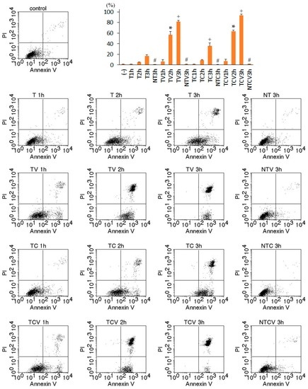 Figure 2. Dual staining of L929 cells with Annexin V (AnV) and propidium iodide (PI). L929 cells were treated with 10 ng/mL TNF (T), 10 μM Z-VAD-fmk (V), 10 μg/mL cycloheximide (C), or 10 μM necrostatin-1 (N) for the indicated times. AnV+/PI: early necroptosis; AnV+/PI+: necrosis (late necroptosis). The graph shows the average of three independent experiments for AnV+/PI+ cells. * p < 0.05 compared to T2h; + p < 0.05 compared to T3h; # p < 0.05 compared to 3 h without necrostatin-1.