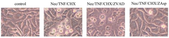Figure 3. Induction of apoptosis in TNF-treated L929 cells in the presence of necrostatin-1 (phase-contrast microscopy, original magnification 400×). L929 cells were treated with 10 μM necrostatin-1 (Nec), 10 ng/mL TNF, 10 µg/mL cycloheximide (CHX) with or without 10 μM Z-VAD-fmk (ZVAD) or 100 μM Z-Asp-CH2-DCB (ZAsp) for 5 h.