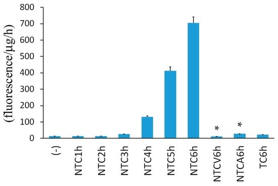 Figure 5. Induction of caspase-3 activity in Nec/TNF/CHX-treated L929 cells. L929 cells were treated with 10 μM necrostatin-1 (N), 10 ng/mL TNF (T), and 10 μg/mL cycloheximide (C) with or without 10 μM Z-VAD-fmk (V) or 100 μM Z-Asp-CH2-DCB (A) for the indicated times. The data shown are the average of a triplicate experiment. The bars indicate one standard deviation. * p < 0.01 compared with NTC6h. Similar results were obtained in three independent experiments.