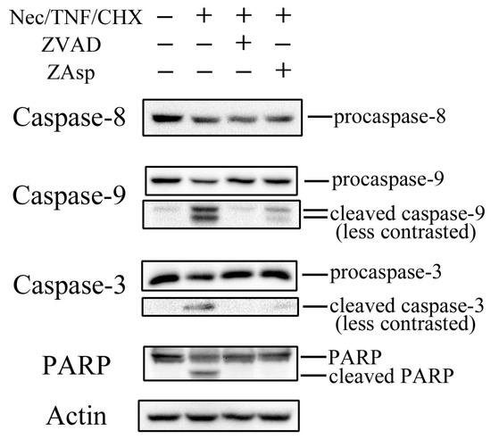 Figure 6. Western blot analysis of proteolytic activation of Caspases. L929 cells were treated with 10 μM necrostatin-1 (Nec), 10 ng/mL TNF, and 10 μg/mL cycloheximide (CHX) with or without 10 μM Z-VAD-fmk (ZVAD) or 100 μM Z-Asp-CH2-DCB (ZAsp) for 5 h, and Western blot analysis of Caspases-3, -8, -9, and Poly(ADP-Ribose) Polymerase (PARP) was performed. The images shown are representative of three independent experiments with similar results.