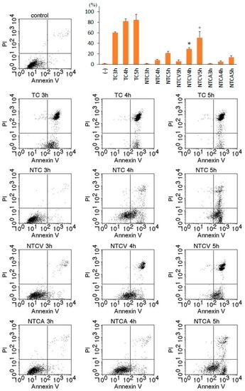 Figure 7. Induction of apoptosis in TNF-treated L929 cells in the presence of necrostatin-1 (dual staining with Annexin V and propidium iodide). L929 cells were treated with 10 μM necrostatin-1 (N), 10 ng/mL TNF (T), 10 μg/mL cycloheximide (C) with or without 10 μM Z-VAD-fmk (V) or 100 μM Z-Asp-CH2-DCB (A) for the indicated times. AnV+/PI: early apoptosis or early necroptosis; AnV+/PI+: necrosis (late apoptosis or late necroptosis). The graph shows the average of three independent experiments for AnV+/PI+ cells. * p < 0.05 compared to NTC4h; + p < 0.05 compared to NTC5h.