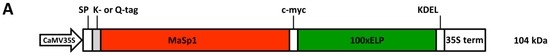 Expression of ELPylated Major Ampullate Spidroin 1 (MaSp1) fusion proteins in tobacco leaves. (A) Schematic representation of the plant expression cassette for the expression of MaSp1-100× ELP monomers. CaMV35S: Cauliflower Mosaic Virus 35S promoter; SP: legumin B4 signal peptide; K- or Q-tag: lysine or glutamine tag; 100× ELP: 100 repeats of elastin-like pentapeptide VPGXG (V:A:G = 5:2:3); KDEL: ER retention sequence; c-myc: immunodetection tag; 35S term: Cauliflower Mosaic Virus 35S terminator; (B) Leaf extracts of transgenic tobacco plants accumulating either K-MaSp1-100× ELP or Q-MaSp1-100× ELP protein and the corresponding wild type cultivar Nicotiana tabacum cv. Samsun NN separated by SDS-PAGE (12% PAA). MaSp1 fusion protein monomers were immunodetected by Western blotting based on the c-myc tag. c-myc standard c+: 2 ng of anti-TNF-VHH-100× ELP [25].