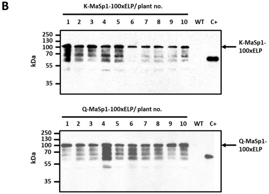 Transgenic tobacco seeds were cultured on Murashige-Skoog agar containing 50 mg/L kanamycin. Developing plants containing recombinant TPs (Q-MaSp1-100× ELP; K-MaSp1-100× ELP) were selected by immunoblotting leaf extracts using an anti-c-myc antibody [47]. Plants were then grown for 11 weeks in soil beds under glass without supplemental light or temperature regulation from May to July. Soil bed plants were fertilized with 0.3% Hakaphos blau (Available online: www.compo.de/) once a week. Before plants began to flower, tobacco leaf material was harvested 15 weeks after sowing.