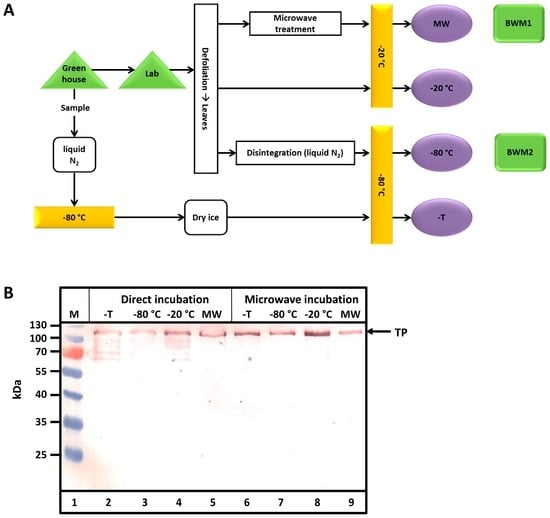 After harvest, defoliated tobacco leaves (bio wet mass, BWM) were handled in various ways (Figure 2A). Samples taken in the greenhouse were either transported to the lab or directly frozen in liquid nitrogen. Transport lasted 60 min at an ambient temperature (16 °C). Samples were either treated in a microwave or disintegrated by milling in liquid nitrogen before storage at −20 or −80 °C. Then, samples were either directly analyzed by sodium dodecyl sulfate-polyacrylamide gel electrophoresis (SDS-PAGE) and Western blotting (direct incubation) or after incubation in a microwave. Leaves at the small (50 g BWM1) and medium (300 g BWM2) scales were used in pilot scale (5–6 kg) experiments. As observed from the Western blots in Figure 2B, only samples heated in the microwave exhibited no TP degradation. Proteolytic degradation clearly occurs in all other cases.