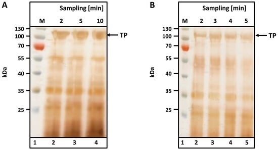 Release of K-MaSp1-100× ELP during cell disruption using: (A) a Waring blender; and (B) a table top cutter. Nicotiana tabacum leaves were incubated in a microwave and then stored at −20 °C. (A) Three hundred grams BWM2 were thawed (16 h, 4 °C), mixed with 450 mL tap water (4 °C) and sheared in a Waring blender for 10 min; (B) Five kilograms leaves in 6 L tap water (4 °C) were disintegrated using a table top cutter for 5 min. Samples were taken at the indicated time points. After centrifugation, 500 µL of the supernatant was dried and resolubilized in 200 µL SDS sample buffer. M-Prestained protein ladder. The arrow indicates the molecular size of the target protein (TP).