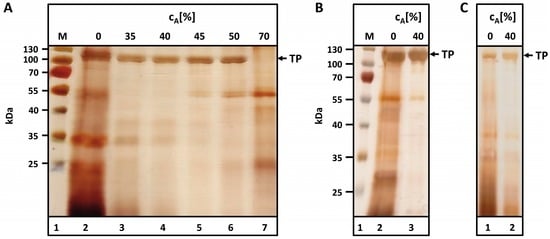 Despite heat incubation, some HCPs remained soluble in the cell extract in addition to the TP (Figure 4A, lane 2). At an acetone concentration of 40% (v/v), most of those contaminants precipitated and could be separated via centrifugation. The TP was soluble up to 50% acetone (v/v) and precipitated at 70% acetone (v/v) (Figure 4A, lanes 5–7). Two major contaminants remained soluble at both 50% (v/v) and 70% (v/v) acetone (Figure 4A, lanes 5–7, bands at ~55 and 25 kDa).