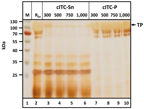 Polishing of Q-MaSp1-100× ELP by centrifugation-based Inverse Transition Cycling (cITC). A washed and lyophilized pellet resulting from fractionating acetone precipitation was resolubilized in 6 M urea and centrifuged. The supernatant (lane 2) was aliquoted and dialyzed against buffers containing 50 mM Tris-HCl (pH 8.0) and NaCl ranging from 300–1000 mM. Samples were then heated to 40 °C and centrifuged. The target protein (TP) was concentrated in the pellet (cITC-P), while soluble contaminants remained in the supernatant (cITC-Sn). M-Prestained protein ladder; RSn-soluble fraction of resolubilized pellet after precipitation with 70% (v/v) acetone. The arrow indicates the molecular size of the target protein (TP).