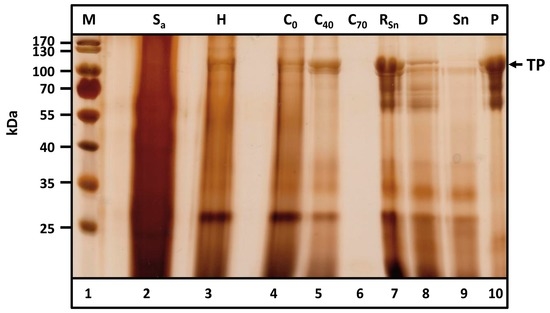 Pilot scale purification of Q-MaSp1-100× ELP from Nicotiana tabacum leaves. Samples of BWM2 (2 kg × 3 kg) were thawed (16 h, 4 °C), mixed with tap water (3 L, respectively) and disrupted (lane 2). The suspension was clarified via filtration (lane 3) and centrifugation (lane 4). Fractionating acetone precipitation was then performed by adjusting the acetone concentration first to 40% (C40—supernatant after centrifugation, lane 5) and then to 70% (C70—supernatant after centrifugation, lane 5). The resulting pellet was washed in tap water and lyophilized. Following resolubilization in 6 M urea and centrifugation, the supernatant (lane 7) was dialyzed against 50 mM Tris-HCl, 750 mM NaCl, pH 8.0 (lane 8). Finally, the target protein (TP) was separated from soluble contaminants via cITC (lanes 9 and 10). M, Prestained protein ladder; Sa, Suspension a; H, Filtrate of the hydro press; C: Supernatants after centrifugation containing 0 (C0), 40 (C40) and 70% (v/v) (C70) acetone, respectively; RSn, Soluble fraction of resolubilized pellet after precipitation with 70% (v/v) acetone; D, RSn dialyzed against 50 mM Tris-HCl with 750 mM NaCl at pH 8.0; Sn, Soluble fraction of the dialysis sample after cITC; P, Pellet of the dialysis sample after cITC. The arrow indicates the molecular size of the target protein (TP).