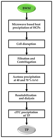 To isolate larger amounts of the TP, the small scale experiment was scaled up to medium and pilot scales. For a simple and cost-effective process, the disruption buffer was replaced with tap water. To reduce the volumes that need to be handled, the solvent/biomass ratio was reduced from 1:3 (BWM:buffer, (w/v); 50 g BWM) to 1:1.5 (BWM:water, (w/v); 300 g BWM) and 1:1 (BWM:water, (w/v), 5–6 kg). Precipitation behavior was found to remain almost unchanged compared to pre-experiments (Figure S1).