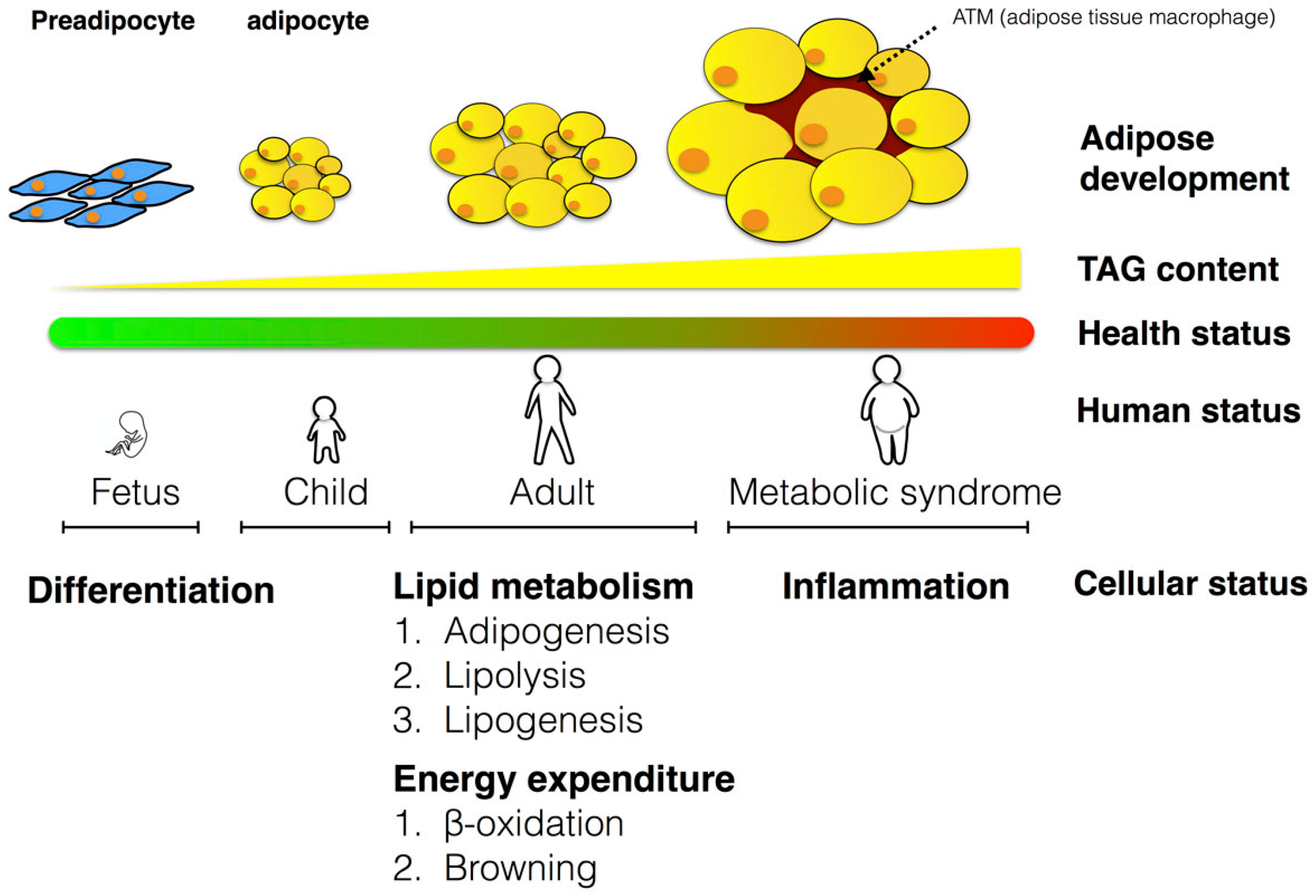 Schematic representation of the physiological changes of adipocytes, including adipose development in different periods of life, and the major mechanisms involved in energy homeostasis. The adipose development proceeds from preadipocytes to adipocytes. The health status from green to red, indicates healthy to unhealthy status. The developmental stages in humans are divided into four major categories, fetal stage, infant stage, adult stage and obese adult stage, to reflect the changing status of adipose tissues throughout life. The cellular status reflects the molecular mechanisms involved in human adipose tissue development. TAG: triacylglycerol.