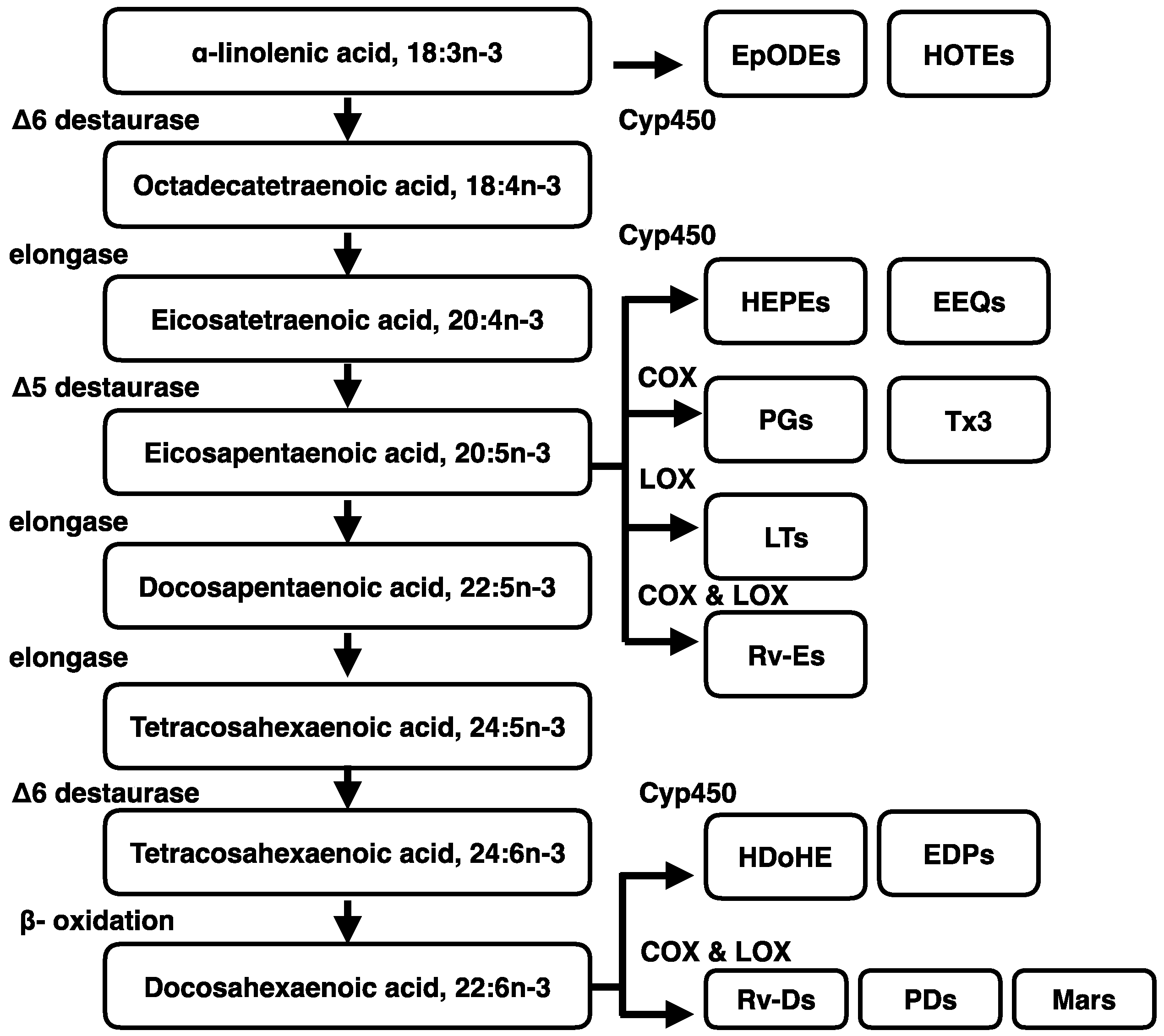 Biosynthesis of n-3 PUFA and its metabolites. EpODEs, epoxyoctadecadienoic acid; EPD, epoxydocosapentaenoic acid; HOTEs, hydroxyoctadecatrienoic acid; HEPEs, hydroxyeicosapentaenoic acids; Tx3, thromboxanes; EEQs, epoxyeicosatetraenoic acid; PGs, prostaglandins; LTs, leukotrienes; COX, cyclooxygenase; LOX, lipoxygenase; Rv-Es, resolvin-Es; HDoHE, hydroxydocosahexaenoic acid; Rv-Ds, resolvin-Ds; PDs, protectin; Mars, maresins.