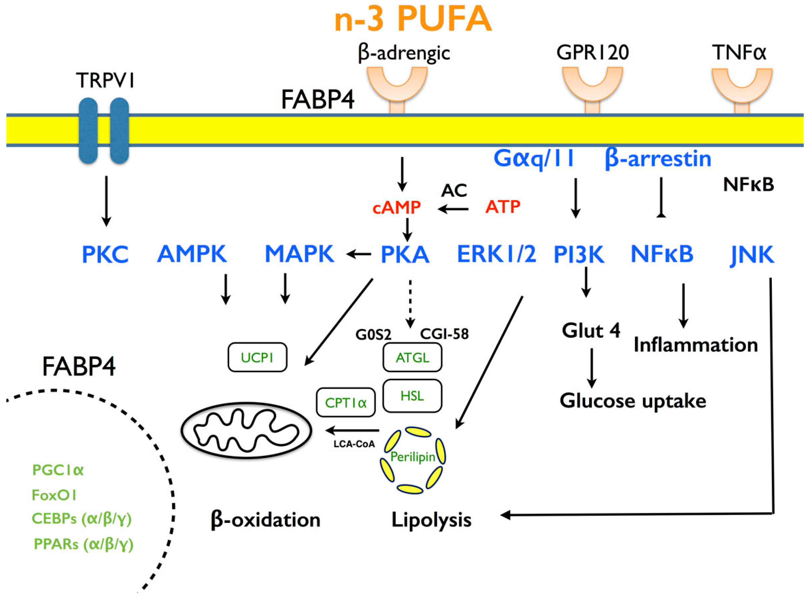 The mechanism of n-3 PUFA at the cellular level. TRPV1: transient receptor potential vanillin 1; FABP4, fatty acid binding protein 4; GPR120, G-protein coupled receptor 120; TNFα, tumor necrosis factor-α; PKC, protein kinase C; AMPK, 5’ AMP-activated protein kinase; MAPK, mitogen-activated protein kinase; PKA, protein kinase A; ERK1/2, extracellular signal-regulated kinase 1/2; PI3K, phosphoinositide-3 kinase; NFκB, nuclear factor κB; JNK, c-Jun N-terminal kinase; UCP1, uncoupling protein 1; CPT1α, carnitine palmitoyltransferease-1α; ATGL, adipose triglyceride lipase; HSL, hormone sensitive lipase; Glut4, glucose transporter 4; PGC1α, peroxisome proliferator activated receptor gamma coactivator 1-α; Foxo1, forehead box O 1; C/EBPs, CCAAT element binding proteins; PPARs, peroxisome proliferator activated receptors.