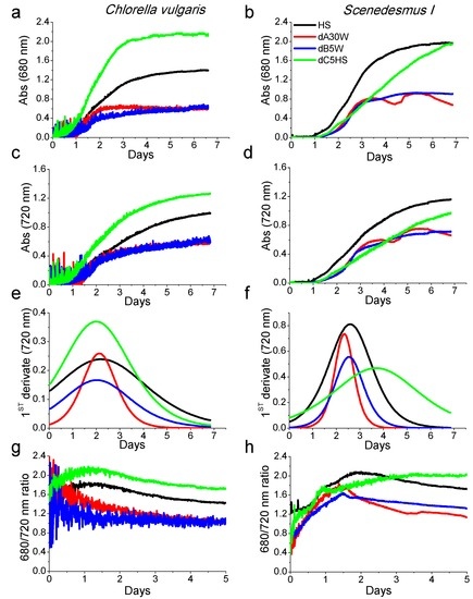 Growth kinetics measured at 680 and 720 nm of C. vulgaris and Scenedesmus I. (a,c) growth curves of C. vulgaris measured at 680 and 720 nm, respectively; (b,d) growth curves of Scenedesmus I measured at 680 and 730 nm, respectively; (e,f) first derivative of 720 nm growth kinetics; and (g,h) ratio of 680 and 720 nm absorption during cultivation.