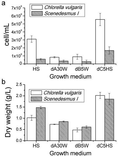 Dry weight of harvested biomass at the end of growth curves is reported in Figure 2b: increased biomass accumulation was evident for cells grown in substrate dC5HS compared to cells grown in HS only, with a 98% and 25% production increase for C. vulgaris and Scenedesmus I, respectively. In the case of the growth medium obtained by diluting dA30W, biomass production was reduced by 28% and 43%, respectively, for C. vulgaris and Scenedesmus I, whereas in the case of dB5W, the decline was 53% for C. vulgaris and 59% for Scenedesmus I. It is important to note that the Scenedesmus cells were generally bigger (Supplementary Materials, Figure S1) compared to C. vulgaris cells, thereby explaining the similar or even increased dry weight of Scenedesmus cultures as compared to C. vulgaris, despite the reduced cell concentration.