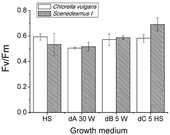 Differences in biomass accumulation in dA30W and dB5W substrates suggest a possible stressing conditions for cells. Quantum efficiency of Photosystem II can be determined by measuring chlorophyll a fluorescence emission through the photosynthetic parameter Fv/Fm. Fv/Fm is a fluorescence parameter commonly used to evaluate the stressing conditions of a photosynthetic organisms, being reduced when photosynthetic apparatus is stressed [34]. In all analyzed conditions, Fv/Fm values ranged between 0.5 and 0.59 (Figure 3), typical values for algae cultures grown in high light conditions [35]. The only exceptions were found in the case of Scenedesmus I grew in dC5HS, where Fv/Fm values reached a value of 0.69. This results indicate that growth in the different growth media did not significantly alter the quantum efficiency of PSII, with the exception of substrate dC for Scenedesmus I cells which were less stressed by high light compared to cells grown in HS only or in dA30W and dB5W. The reduction of biomass accumulation observed for dA and dB should not be related to a specific destabilization of photosynthetis apparatus, but rather to the availability of the different nutrients.