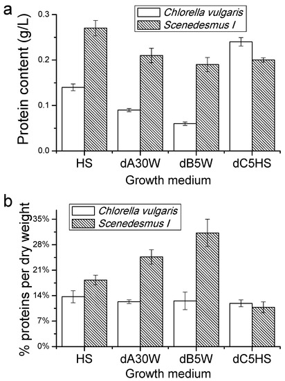 Accumulation of proteins, lipids and pigments by cells of C. vulgaris and Scenedesmus I grown in photobioreactors were determined at the end of the growth curves. As reported in Figure 4, C. vulgaris showed a maximum production of proteins per volume of culture (g/L) when grown in substrate dC5HS, while a strong decrease in total proteins produced by C. vulgaris culture grown in dB5W. Differently, no significant change was observed in the protein produced in the Scenedesmus I cultures. The percentage of protein content per biomass produced did not significantly changed in C. vulgaris, while an increase was evident for Scenedesmus I grown in dA30W and dB5W with a maximum level of 31.1% in the latter case. The lowest content of proteins per g of biomass accumulated was instead measured in the case of Scenedesmus I grown in dC5HS, with a value of 10.8% of cell biomass being proteins.