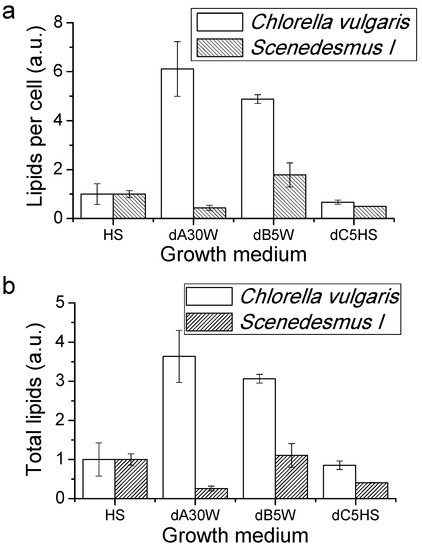 Lipid content has been determined by Nile red staining, a probe which fluorescence emission at 575 nm increases in nonpolar environments, a commonly used assay for determination of lipids concentration in microalgae [36]. As shown in Figure 5, C. vulgaris grown in substrates dA30W or dB5W, were characterized by a strong increase of lipid content per cell or per total volume of culture compared to cells grown in dC5HS or in HS only. The lipid content increase may be attributable to a nutritional stress condition, resulting in a buildup of triacylglycerides, typically adopted as a reserve molecule to survive in adverse environmental conditions [37]. In contrast, only a 45% increase in lipid content per cell was recorded for Scenedesmus I grown in dB diluted in water compared to cells grown in HS, resulting into a similar lipid productivity per volume of culture. Scenedesmus I grown in dA30W or dC5HS instead showed a decrease of lipid content per cell and lipid accumulation per volume of culture compared to cells grown in HS.
