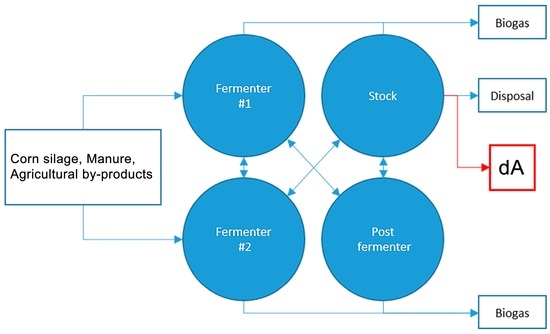 The substrate referred to as dA derives from the treatment of livestock effluents originated by the biogas producing plant described in (Figure 6) located at the site of Ca’ Bianca Agricultural Company LTD in Isola della Scala (Verona, Italy). The plant consists of two pre-fermenters, one post-fermenter and a storage tank (warmed and mixed) in which organic matter is anaerobically digested with the concomitant production of biogas. The residual digestate (dA) looks like a thick brown liquid.