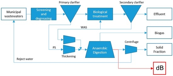 Substrate B were collected from the municipal wastewater treatment plant (WWTP) of Verona (Veneto Region, Italy) which has a design treatment capacity of 300,000 PE (Person Equivalent, which indicates a 60 g biochemical oxygen demand in five days for biological degradation of organic matter). The treatment plant is schematically represented in (Figure 7) with an anaerobic digestion of 400−450 m3/day of primary and waste-activated sludge (PS and WAS) at mesophilic conditions (37 °C): the resultant sewage sludge from the primary sedimentation of the wastewater and its further biological treatment are thickened and anaerobically digested, determining biogas production. The hydraulic retention time (HRT) of the anerobic digestor is mantained between 22 to 25 days. The PS and the WAS are separately thickened up to 30−58 g/L of total solids by dynamic thickening (Klein Technical Solutions, Niederfischbach, Germany) and a screw drum (Huber, Screw Thickener RoS 2, Munich, Germany), respectively. Substrate dB is collected downstream of this process and it is presented as a turbid liquid.