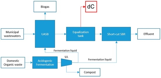 The pilot plant in (Figure 8) simultaneously carries out municipal wastewater treatment and disposal of organic fraction of municipal waste disposal. Substrate dC is collected downstream of the anaerobic treatment accomplished by UASB reactor (upflow anaerobic sludge blanket). This kind of reactor relies on the presence of an active granular sludge bed that works as a filter and actively treats water entering from the bottom, while the organic fraction of the municipal solid waste is fermented for the production of readily biodegradable COD [33]. In addition, around 50% of the daily fermentation liquid produced was fed to the UASB reactor in order to boost the biogas production. The final effluent was sampled from a buffer tank after around 2 days of HRT and then stored in a fridge at 2 °C.
