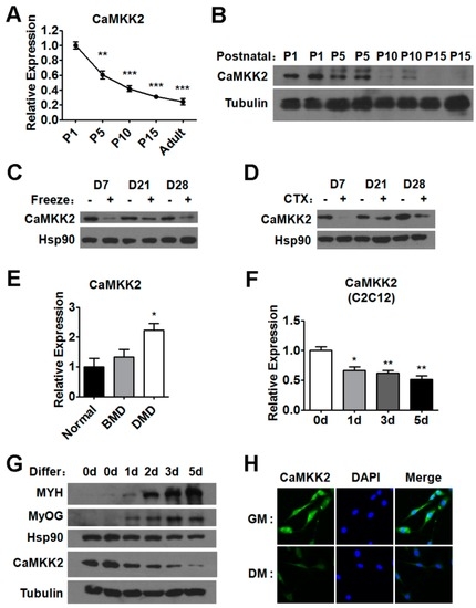 Expression levels of CaMKK2 in skeletal muscle during myogenesis and regeneration. (A) Quantitative RT-PCR analysis of CaMKK2 levels in postnatal myogenesis (n = 4); (B) Representative western blot showing the CaMKK2 protein levels in postnatal myogenesis; (C) Representative western blot showing the CaMKK2 protein in freeze injury-induced regeneration (n = 4); (D) Representative western blot showing the CaMKK2 protein levels in CTX injury-induced regeneration (n = 4); (E) Quantitative RT-PCR analysis of CaMKK2 levels in BMD or DMD patients (n = 3); (F) Quantitative RT-PCR analysis of CaMKK2 mRNA levels during C2C12 myoblasts differentiation (n = 3); (G) Western blotting analysis of CaMKK2, MYH and MyoG protein levels during C2C12 myoblasts differentiation; and (H) Immunofluorescence analysis of CaMKK2 was performed in C2C12 myoblasts and myotubes (GM, growth medium; DM, differentiation medium). Experiments were repeated at least twice. Means ± SEM (error bars) are shown. *, p < 0.05; **, p < 0.01; ***, p < 0.001.