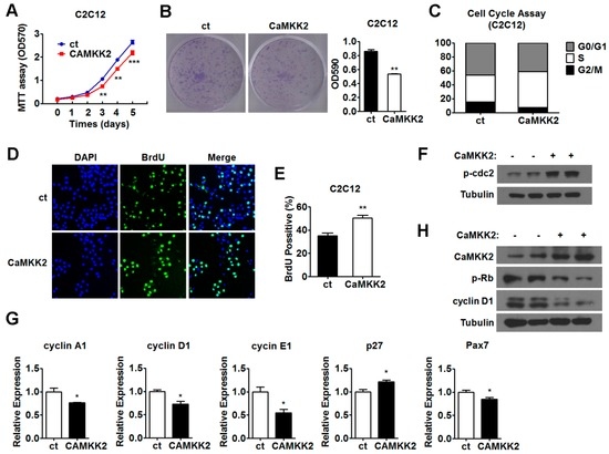 Since myogenic proliferation and differentiation are two important processes during muscle regeneration, to test our hypothesis, we first investigated the effect of CaMKK2 on proliferation in C2C12 myoblasts. We found that transfection of a CaMKK2 expression plasmid was able to suppress C2C12 myoblasts proliferation as shown by MTT assay and crystal violet staining (Figure 2A,B). The transfection efficiency was evaluated by both Western blot and qRT-PCR analysis (Figure S2A,B). Cell cycle analysis by flow cytometry showed that, after CaMKK2 transfection, the proportion of G1 phase and G2 phase cells decreased, and the proportion of S phase cells increased compared with control group treated with empty vectors (Figure 2C). Consistently, we found that there were more BrdU positive cells after CaMKK2 transfection (Figure 2D,E), which reflected high rate of DNA synthesis, indicating that most part of cells stayed in S phase. Thus, our preliminary speculation was that CaMKK2 overexpression induced C2C12 cell S phase arrest and inhibited C2C12 myoblast proliferation. In accordance with these results, we found that cdc2-Tyr15 phosphorylation was increased by CaMKK2 overexpression (Figure 2F). During S phase, the activity of cdc2-Tyr15 kinase is high [21]. Some studies showed that cdc2-Tyr15 phosphorylation acted as a central mechanism for S phase arrest, when cells arrested in S phase, cdc2-Tyr15 phosphorylation was up-regulated [22]. Thus, this result was consistent with cell cycle assay, and further supported the notion that high levels of CaMKK2 expression could lead to S phase arrest in C2C12 cell line.
