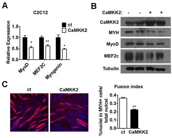 Since the CaMKK2 expression was decreased in postnatal myogenesis (Figure 1A,B) and the expression of CaMKK2 mRNA and protein was negatively correlated with the levels of myogenic markers during myogenic differentiation (Figure 1F,G and Figure S1F,G), we speculated that CaMKK2 might have an effect on C2C12 cell differentiation. To test this hypothesis, C2C12 cells were transfected with CaMKK2 plasmids on the first day of differentiation. We found that mRNA levels of MyoD, MEF2c and Myogenin decreased by approximately 50% compared to the negative control group (Figure 3A), and the protein levels of MYH, MyoD and MEF2c decreased after CaMKK2 overexpression (Figure 3B). The MYH expression was also analyzed by immunofluorescence to examine the myotube formation in cultured C2C12 cells after 48 h transfection. We observed a decrease of myotube formation after CaMKK2 overexpression (Figure 3C). These results clearly demonstrated that CaMKK2 overexpression inhibited myoblast differentiation in vitro.