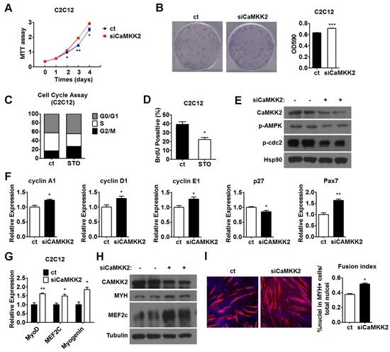 The effect of CaMKK2-specific siRNA on the C2C12 myogenesis was also examined. We observed that the mRNA levels of MyoD, MEF2c and Myogenin increased by approximately 1.5-fold, and the protein levels of MYH and MEF2c increased in siCaMKK2-transfected C2C12 myotubes compared to the control groups (Figure 4G,H). The MYH expression was also analyzed by immunofluorescence to examine the myotube formation. We observed an increase of myotube formation compared to the control group (Figure 4I). Similar results were obtained when siCaMKK2-b was used (Figure S2H,I). These results clearly demonstrated that CaMKK2 knockdown could promote C2C12 myoblast differentiation. Together, we hypothesized that CaMKK2 negatively regulates myoblast proliferation and differentiation.
