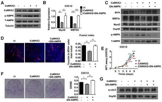 CaMKK2 inhibits C2C12 myoblasts proliferation and differentiation through AMPK activation. (A) Representative western blot showing the p-AMPK protein levels in the C2C12 cells transfected with CaMKK2 plasmids; (B) Quantitative RT-PCR analysis of MyoD, and MEF2c mRNA levels in C2C12 myotubes transfected with CaMKK2 plasmids and then treated with DN-AMPK adenovirus for 48 h (n = 3); (C) Representative western blot showing the MYH, MyoD and MEF2c protein levels in C2C12 myotubes transfected with CaMKK2 plasmids and then treated with DN-AMPK adenovirus for 48 h; (D) Immunofluorescence analysis of MYH was performed in C2C12 myotubes transfected with CaMKK2 plasmids and then treated with DN-AMPK adenovirus for 48 h (left), quantification of the fusion index of indicated cells (right) (n = 3); (E) MTT assay of the proliferation ability of C2C12 myoblasts transfected with CaMKK2 or control plasmids, and then treated with DN-AMPK adenovirus and maintained over a period of 5 days; (F) Representative micrographs of crystal violet-stained C2C12 cell colonies, which were transfected with CaMKK2 or control plasmids, and then treated with DN-AMPK adenovirus (left), absorbance of each well at 590 nm (right) (n = 3); and (G) Representative western blot showing the p-cdc2 Tyr15 protein levels in C2C12 myotubes transfected with CaMKK2 plasmids and then treated with DN-AMPK adenovirus for 48 h. Experiments were repeated at least twice. Means ± SEM (error bars) are shown. *, p < 0.05; **, p < 0.01; ***, p < 0.001.