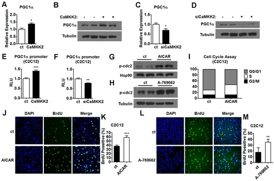 The mechanism of AMPK inhibits C2C12 myoblasts proliferation and differentiation. (A) Quantitative RT-PCR analysis of PGC1α mRNA levels in C2C12 myotubes transfected with CaMKK2 plasmids (n = 3); (B) Representative western blot showing the PGC1α protein levels in the C2C12 cells transfected with CaMKK2 plasmids; (C) Quantitative RT-PCR analysis of PGC1α mRNA levels in C2C12 myotubes transfected with siCaMKK2 (n = 3); (D) Representative western blot showing the PGC1α protein levels in the C2C12 cells transfected with siCaMKK2; (E) PGC1α transcriptional activity in C2C12 cells co-transfected with CaMKK2 and PGC1α promoter plasmids (n = 3); (F) PGC1α transcriptional activity in C2C12 cells co-transfected with siCaMKK2 and PGC1α promoter plasmids (n = 3); (G,H) Representative western blot showing the p-cdc2 Tyr15 protein levels in C2C12 myoblasts treated with 0.25 mM AICAR (A,G,I) and 80 μM A-769662 (H) for 48 h; (I) Flow cytometric analysis of C2C12 myoblasts treated with 0.25 mM AICAR for 48 h during proliferation. Percentage of cells in G1, S and G2 phases were analyzed (n = 3); (J,L) DNA synthesis in C2C12 cells treated with 0.25 mM AICAR (J) or 80 μM A-769662 (L) by BrdU incorporation assay; (K,M) Quantification of the BrdU positive cells (n = 3) in C2C12 cells treated with 0.25 mM AICAR (K) or 80 μM A-769662 (M) by BrdU incorporation assay. Experiments were repeated at least twice. Means ± SEM (error bars) are shown. *, p < 0.05; **, p < 0.01; ***, p < 0.001.