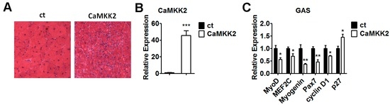 The in vitro findings that CaMKK2 is able to affect C2C12 cell proliferation and differentiation through AMPK activation promoted us to check the effect of CaMKK2 on skeletal muscle regeneration. Gastrocnemius muscle was transfected with CaMKK2 plasmids by electroporation. After freeze injury, muscle histology was examined at day 14 after electroporation (Figure 7A). The CaMKK2 transfection efficiency was evaluated by qRT-PCR analysis (Figure 7B). We found that muscle regeneration in CaMKK2 overexpressing gastrocnemius muscles was dramatically impaired compared to the control muscles. Consistently, we found that the mRNA levels of differentiation and proliferation markers, including MyoD, MEF2c, Myogenin, Pax7 and cyclin D1were decreased significantly, while p27 was increased compared to the control group (Figure 7C). These in vivo results indicated that overexpression of CaMKK2 inhibited skeletal muscle regeneration.