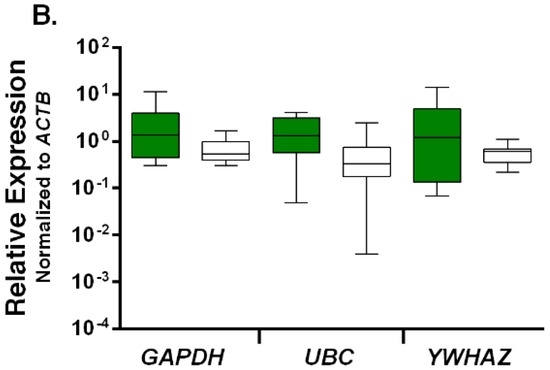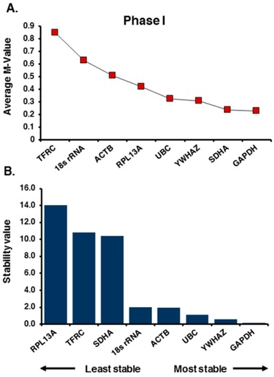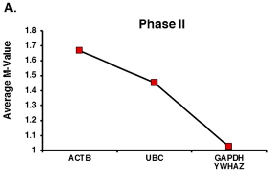The above observations are in support of the ranking validity of the candidate reference genes by geNorm and NormFinder algorithms, and they clearly demonstrate how selection of an inappropriate HKG as reference can bias interpretation of RT-qPCR data. Interestingly, examination of the Cq values obtained for the candidate HKGs using a third statistical algorithm applet, called BestKeeper [44], produced a similar ranking for the candidate reference genes, in particular for Phase II (Table S4). It should be noted that the BestKeeper algorithm works by calculating the SD for each gene of interest and Pearson’s coefficient of correlation for each pair of the candidate genes. Thus, it would be best suited for our Phase II analysis, as BestKeeper cannot provide significant p-values for small sample sets (Table S4A,B). Nonetheless, based on the intra-variations for each candidate gene, the Phase I ranking by BestKeeper is not that far off from those produced by geNorm and NormFinder.