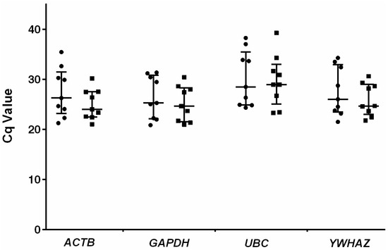 Scatter plot representations of the Cq values measured for the final four candidate genes. Filled squares and circles represent the control and autistic groups, respectively. The vertical bars indicate the median and interquartile range. The bottom and top of each bar represent the 25th and 75th percentiles, respectively, and the line bisecting each bar shows the median Cq value.